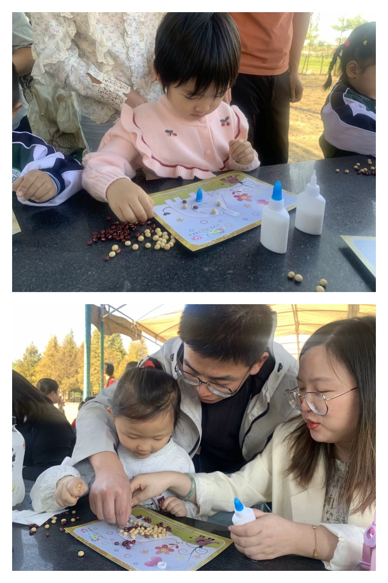 小朋友们在爸爸妈妈的指导下,用黄豆和红豆制作了一幅幅漂亮的“豆豆画”。