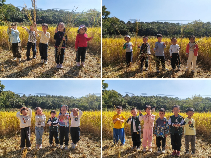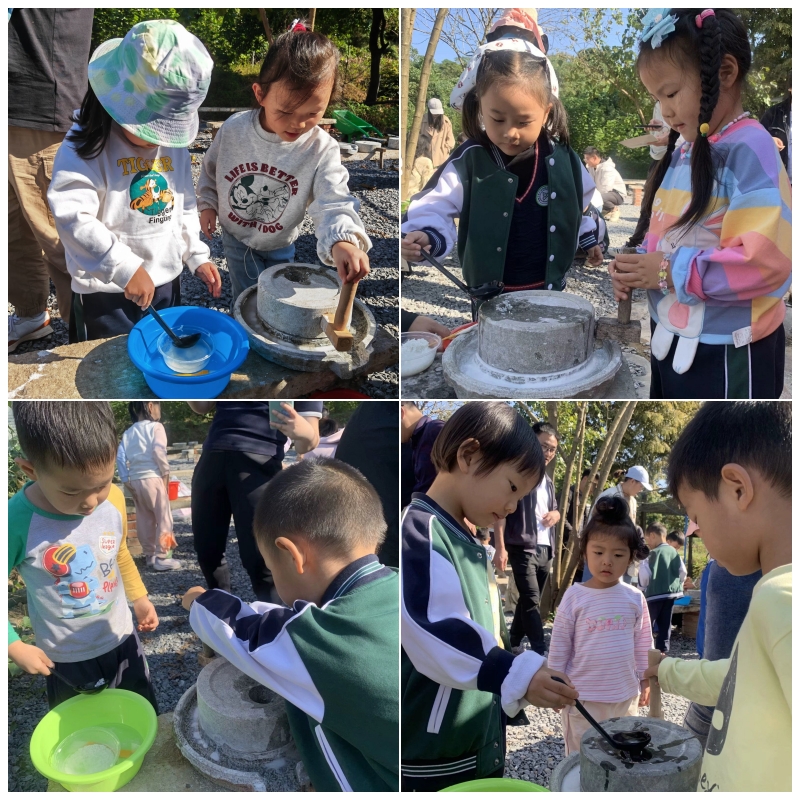 阵阵秋风,从远处吹来,小朋友们一边背着“锄禾日当午,汗滴禾下土”,一边和爸爸妈妈一起体验割稻子、打稻籽、磨米浆,亲身体验了“谁知盘中餐,粒粒皆辛苦”。