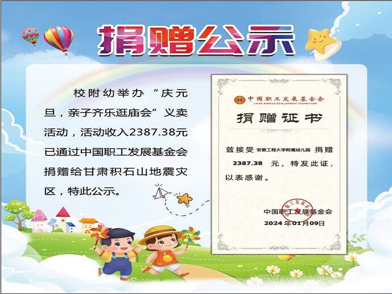 为贯彻落实学校“三全六专”育人实践,培养孩子乐于助人的良好品质,让娃娃们从小“正”起来,近日,校附幼积极响应校工会支援甘肃青海抗震救灾公益行动倡议,以“庆元旦,亲子齐乐逛庙会”义卖活动为载体,开展爱心捐款活动。此次义卖活动收入2387.38元已通过中国职工发展基金会捐赠给甘肃积石山地震灾区。