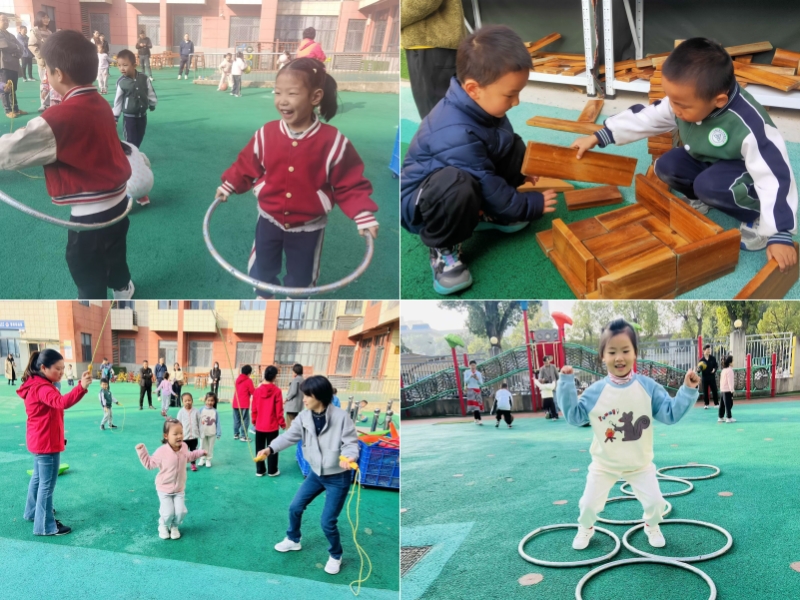 虽然天气寒冷,但园内欢声笑语,处处洋溢着大家庭的温暖。家长8:00先到园内户外参观了阳光体育晨间活动,孩子们开心地在户外滚轮胎、跳圈、玩碳化积木,大家团结合作、互帮互助,其乐融融。整齐划一的表演操、韵律操展示了幼儿积极向上的运动活力。