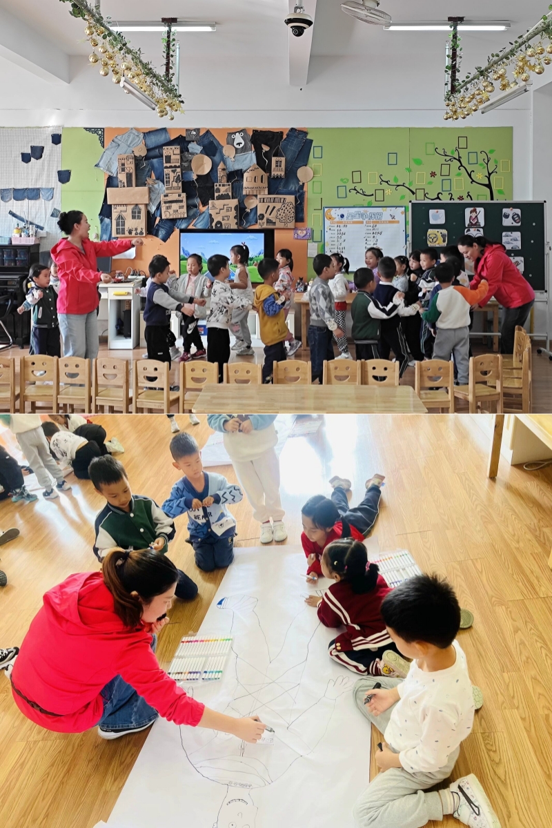 9:10分,家长陪同孩子们走进教室,观摩集体教学活动。任老师给孩子们上了一节有趣的音乐活动课《朱迪警官送货记》,孩子们尽情地倾听音乐,感受歌曲活泼欢快的旋律,结合音乐舞动身体,自由地组队“送货”。活动过程中,孩子们体会到了“送货”成功的喜悦和“送货”途中的艰辛和不易,学会了做事情需要勇敢和坚持。接着,夏老师给孩子们上的是生动的《123木头人》,让小朋友们在人体轮廓上细心地装饰,感知色彩和线条的美,学习各种装饰线条和纹路手法,体验合作绘画与创作的乐趣。活动的每一个环节都凝聚着老师们的用心和巧妙设计,小朋友们都有发言和动手的机会,让家长们看到了自己的孩子在幼儿园的表现,感受到了老师的付出和孩子们的进步。