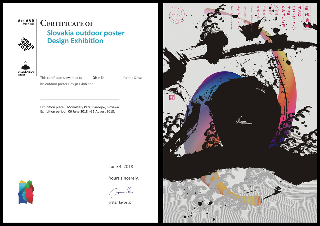 旨在提高中国文化影响力的斯洛伐克户外海报展—中国平面海报设计联展于2018年5月25日至8月31日在斯洛伐克弗兰提斯卡诺二号大街巴尔代约夫公园成功开展。共有来自中国的50位设计师和艺术家的海报作品的参展,我校艺术学院史启新副教授海报《道法自然》成功入展。