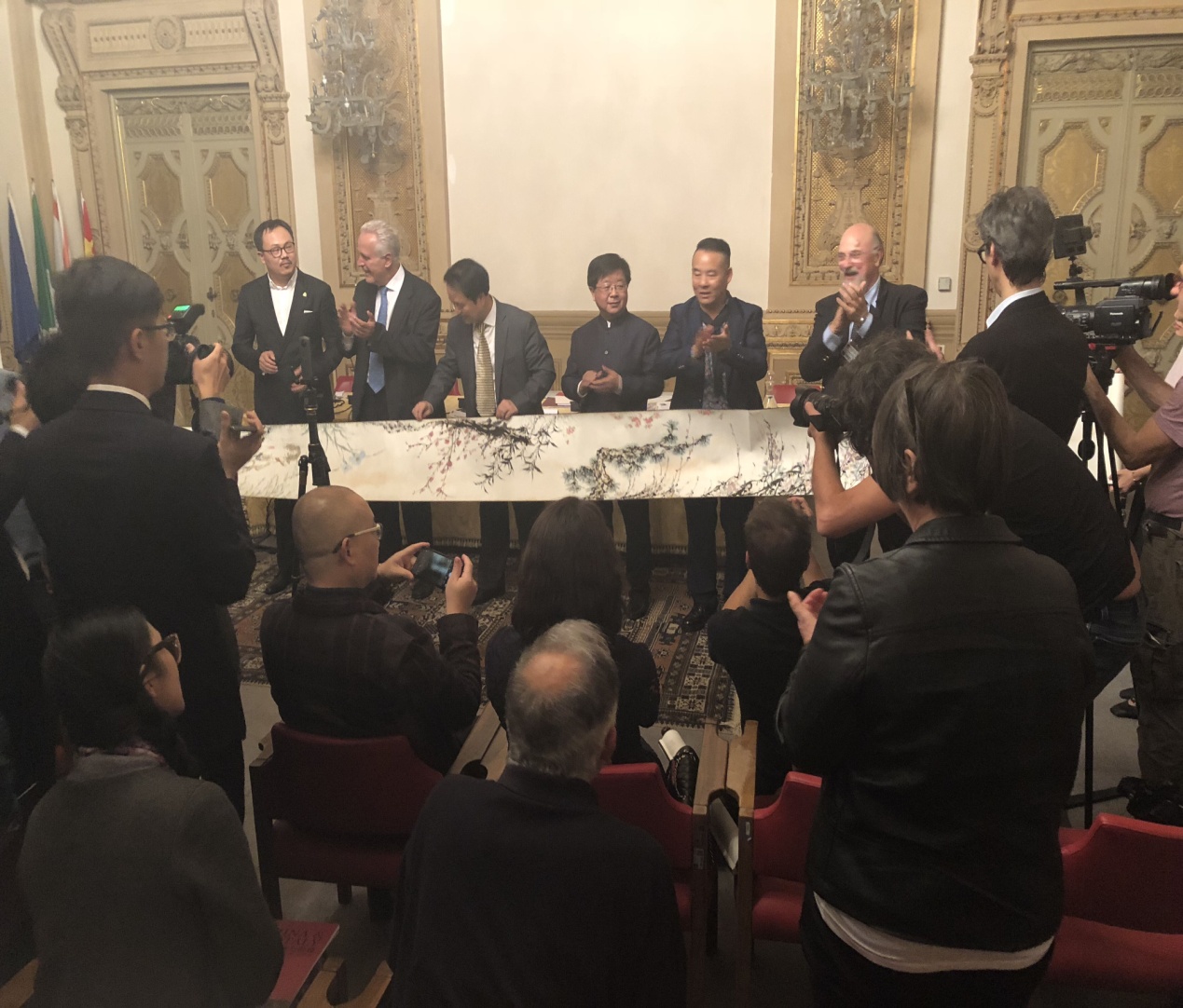最后,为了感谢意大利大区政府和艺术基金会给予此次展览的帮助,承杰代表参展艺术家分别向他们赠送了由我校臧亚平老师创作的10米长卷【百花争艳图】和画家汝萍创作的宣纸工笔画【七月荷风】。