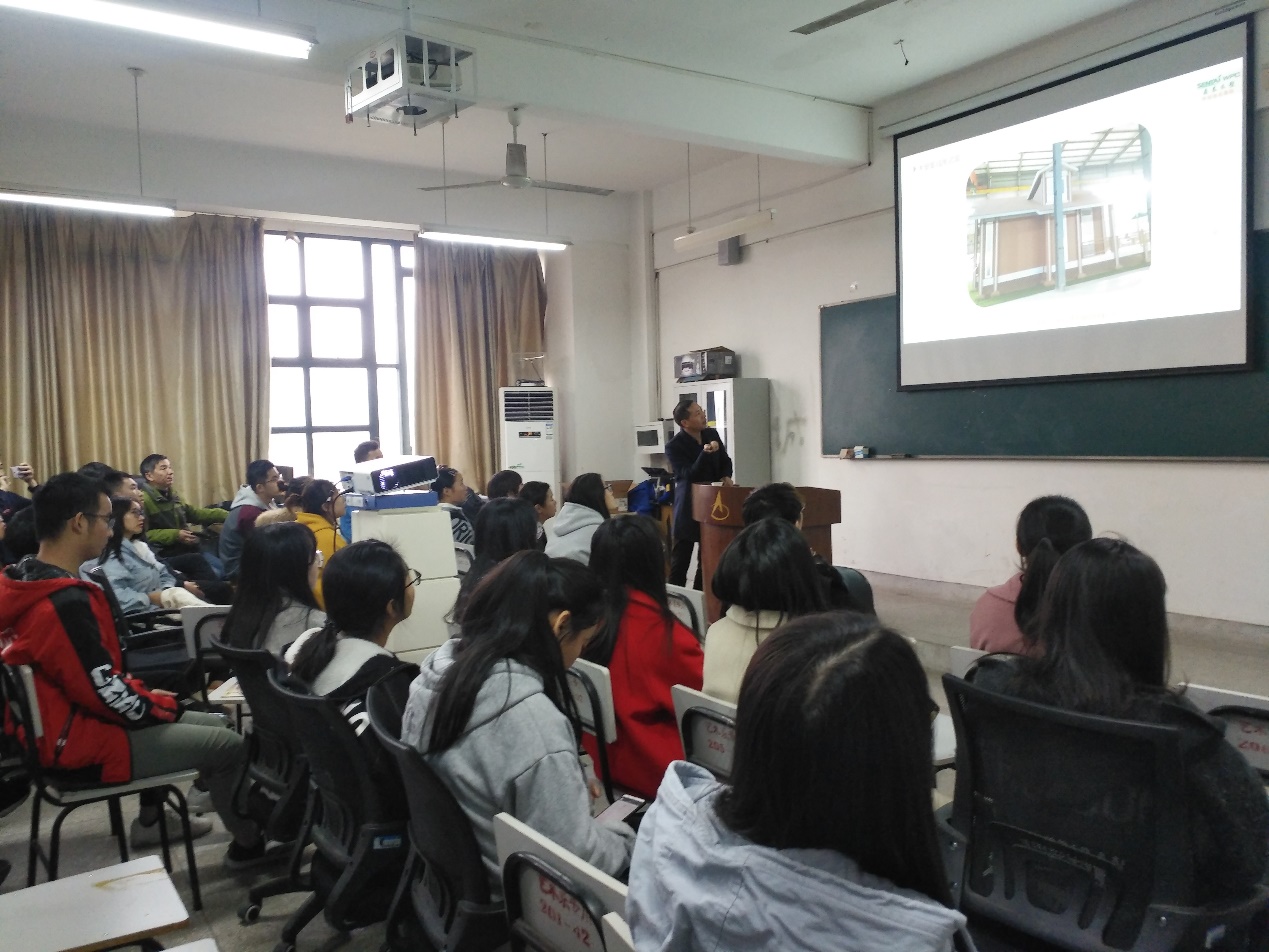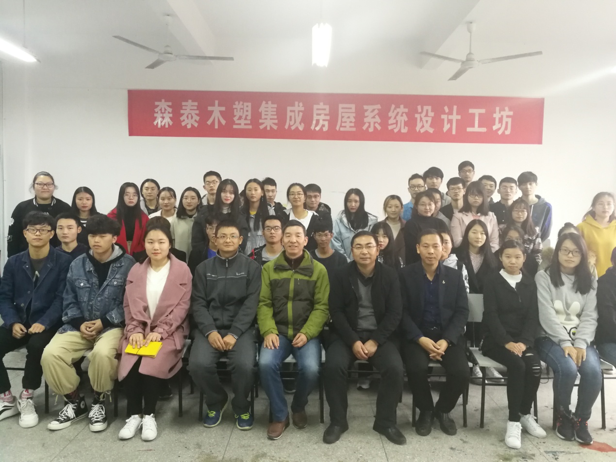 工坊活动开始,先由安徽森泰易可搭集成房屋建设有限公司总经理吴述春为大家介绍了目前公司的情况,并鼓励大家积极学习,随后安徽鸿泰建筑设计公司设计总监黄晋双为工坊同学们做了一场题为“森泰木塑集成房屋系统设计分享”的交流会。他以亲生经历为背景,讲述了自己参与的三个项目的过程及经验,为学生上了一堂生动的专业课,同学们受益匪浅。