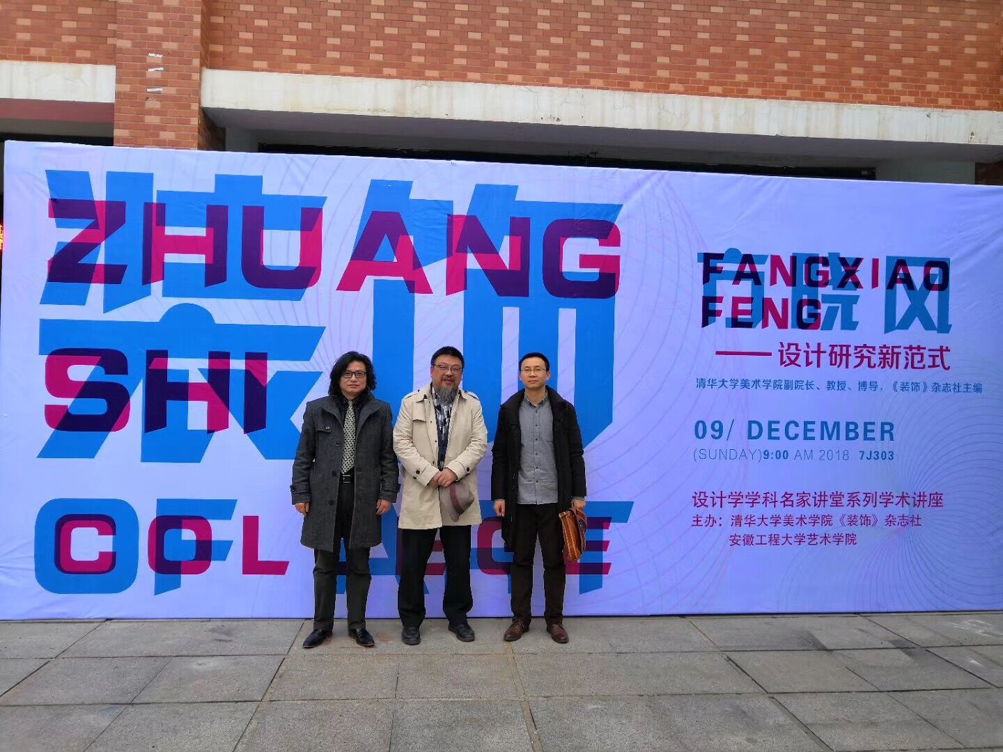 2018年12月9日,艺术学院邀请清华大学美术学院副院长、《装饰》杂志主编、博士生导师方晓风教授来我院举办第二场设计学学科学术研究系列讲座,并与我院教师、近百名研究生进行论文写作方面的学术交流,我院黄凯院长、张学东副院长、建筑工程学院陆峰院长出席,讲座由黄凯院长主持。