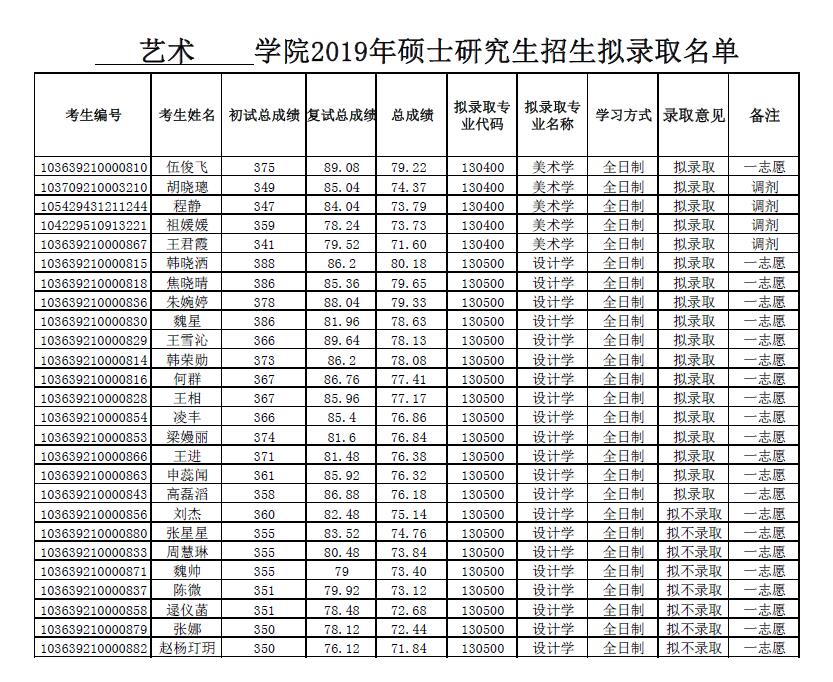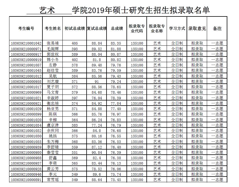 艺术学院2019年硕士研究生招生拟录取名单