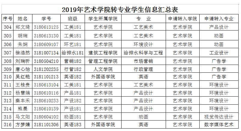 2.艺术学院将根据教务处发布的转专业学生信息,于5月8日下午2:30-5:30完成学院完成对申请转入学生的考核工作,具体名单见下表: