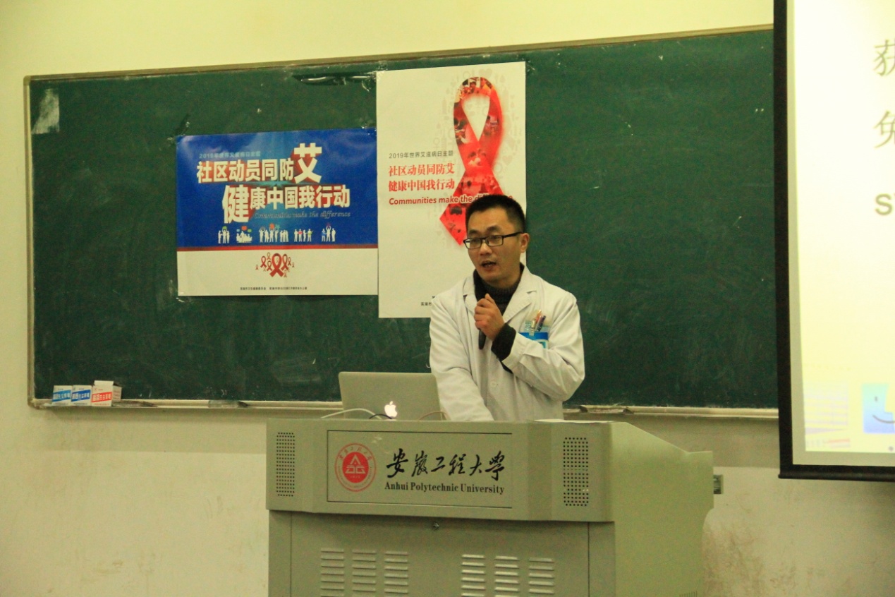 12月1日是第32个世界艾滋病日。为普及艾滋病知识,增强大学生的艾滋病预防意识。12月3日,在6号教学楼212教室,芜湖市第五人民医院皮肤科主任医生胡源应邀为学院部分师生代表进行了一场以“社区动员同防艾,健康中国我行动”为主题的防艾讲座。
