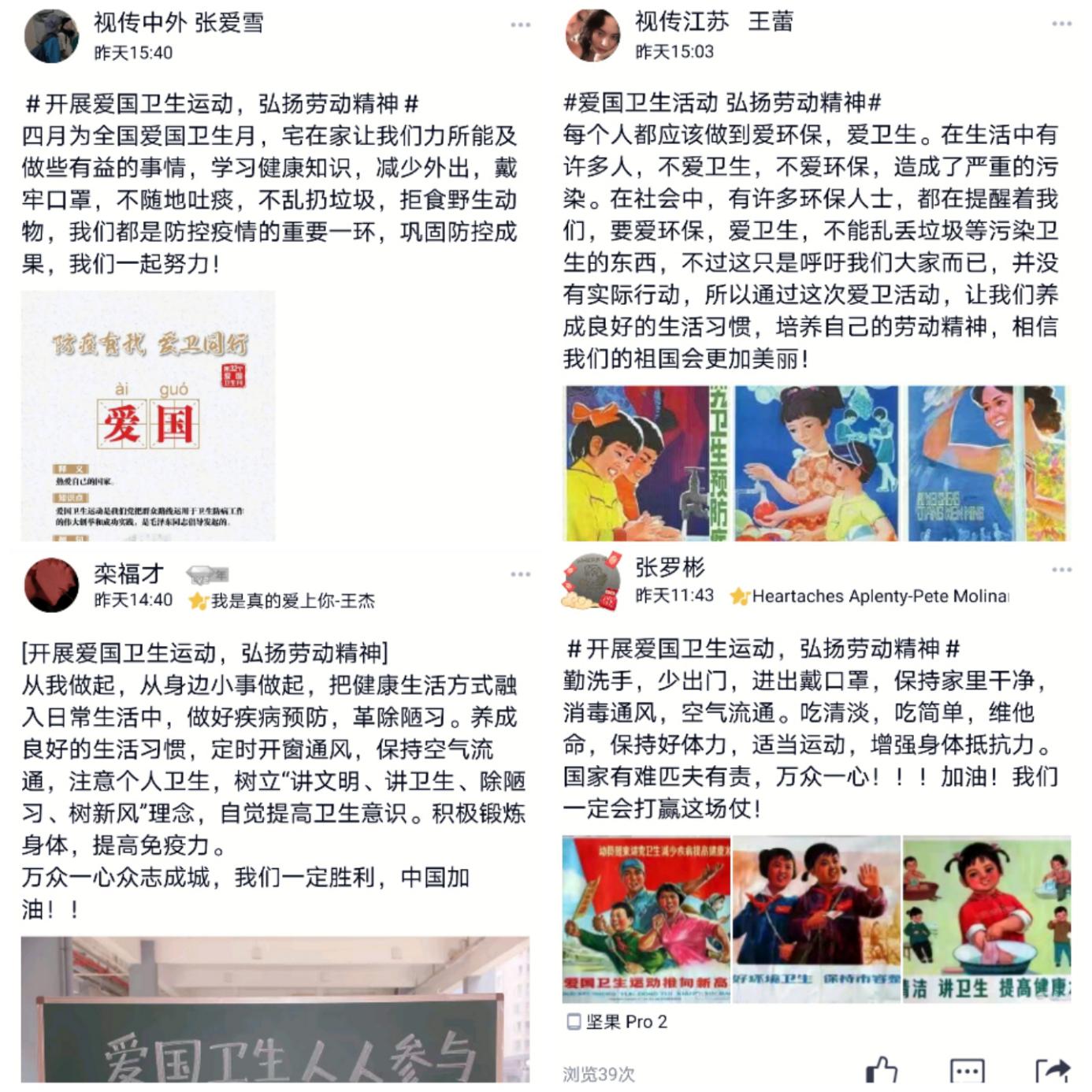 利用网络平台开展“防疫有我,爱卫同行”线上主题团日,组织全体团员青年认真学习习近平总书记关于劳动精神、爱国卫生运动的讲话精神。围绕“爱国卫生月”开展线上研讨与交流,利用QQ、微博、微信、抖音等新媒体平台发声,大力宣传开展爱国卫生运动的意义,普及爱国卫生运动历史,弘扬爱国主义精神,筑牢防疫思想阵地。
