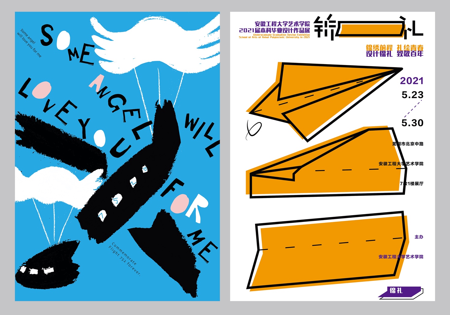 作品《Liberal Presents》这件作品是她为艺术学院2021届本科毕业设计作品展所创作的主视觉海报。该作品中的图形自下而上看是一只由白纸经过折叠而来的纸飞机。白纸寓意着大学生初入大学校门时的懵懂,折叠的纸张寓意着大学对学生的培养过程,而纸飞机则象征着学生四年学成,对未来美好生活充满憧憬,怀揣着梦想飞的更高更远更好。这是一个从“无”到“有”的孕育过程。