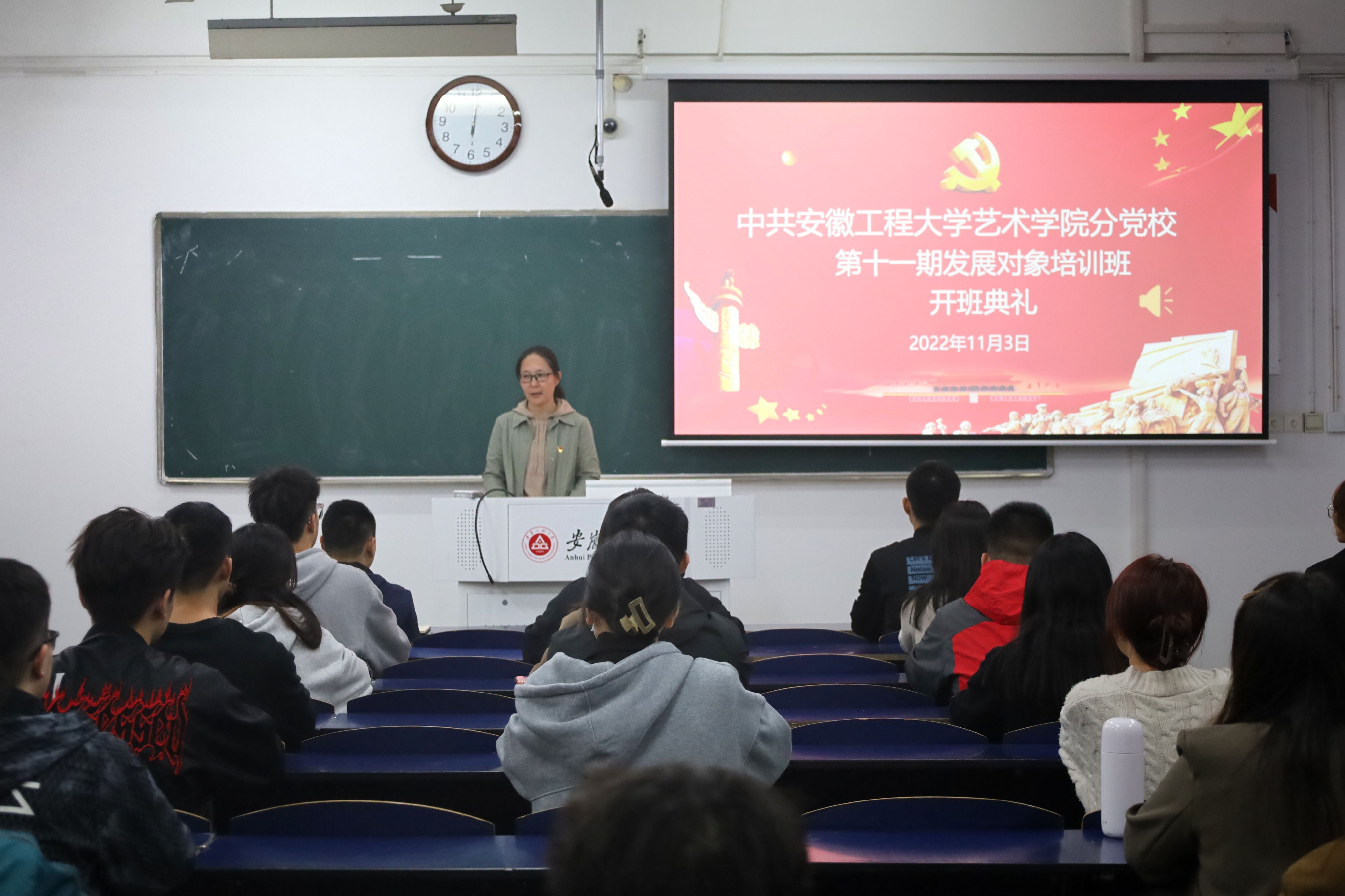 为深入学习宣传贯彻党的二十大精神,按照学校“三抓”和“三全六专”工作要求,切实提升党员发展质量,激励广大党员发展对象以昂扬姿态奋进新征程,11月3日下午,艺术学院分党校在6教108举行第十一期发展对象培训班开班仪式。学院党委副书记彭海燕、团委负责人袁自坤及各学生党支部书记出席。培训班班主任姚丽主持。