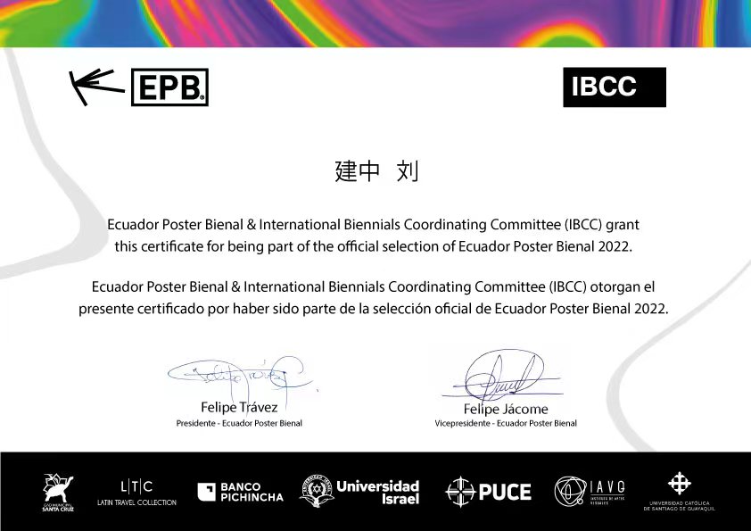 刘建中同学对海报设计有着浓厚的兴趣,主动钻研,在其导师史启新教授的悉心指导下,专业能力得到了长足的进步,养成了认真对待每一件作品的态度。刘建中同学在诸多艺术设计专业赛事中屡屡入选和获奖,如:获得2022塞尔维亚世界大学生海报双年展入选奖、2022白金国际创意奖入选奖、2021全国数字媒体艺术大赛(国赛)三等奖、全国包装设计大赛优秀奖、入选2020万物同生——飞鱼国际公益奖、入选2021全国大学生生肖大赛、2020第二届台湾国际大学生艺术年度奖银奖、第六届国际环保艺术设计大赛铜奖、日本概念设计奖银奖等。