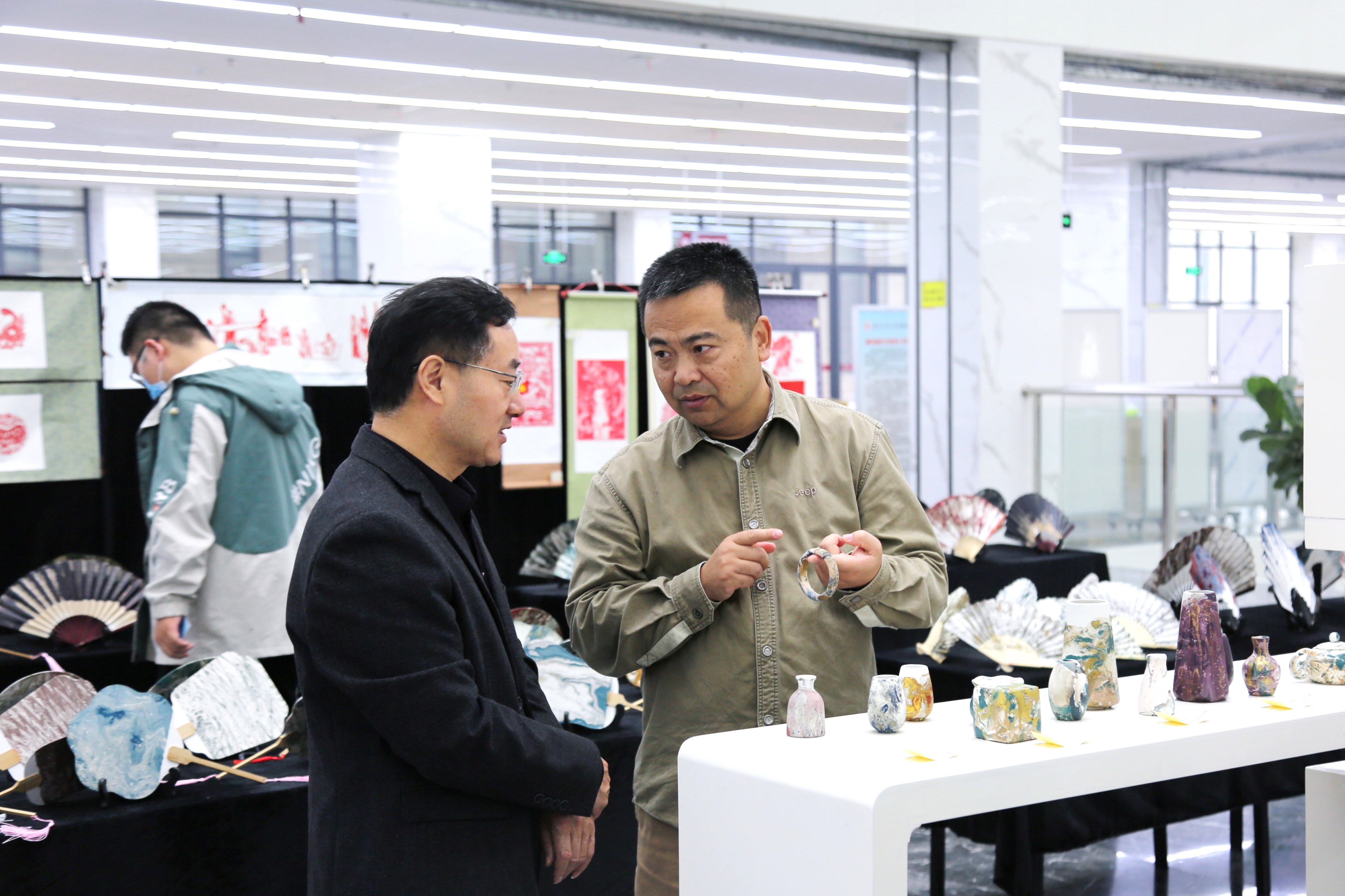 “听说那边有漆艺和剪纸作品,可精美了。走,我们快去瞧瞧!”寻声而去,是正在学校图书综合楼一楼大厅举办的“妙剪生花漆韵传承”专业作品展。