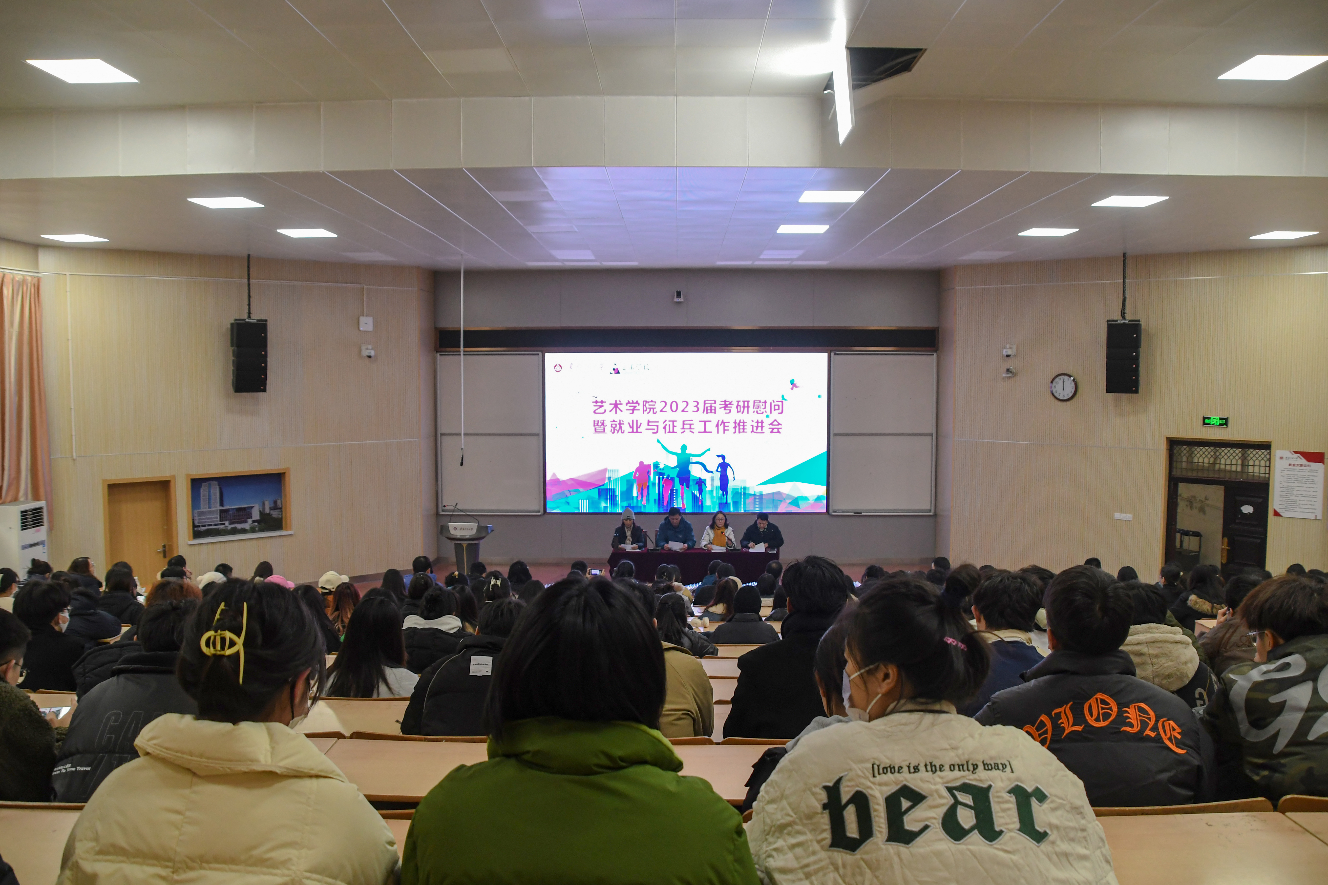 12月9日下午,艺术学院在2教报告厅召开2023届毕业生考研慰问暨就业与征兵工作推进会。学院党委书记胡家增、副书记彭海燕、常务副院长张学东、副院长王小元、教研室主任、辅导员、毕业班考研学生和部分学生代表参加会议。
