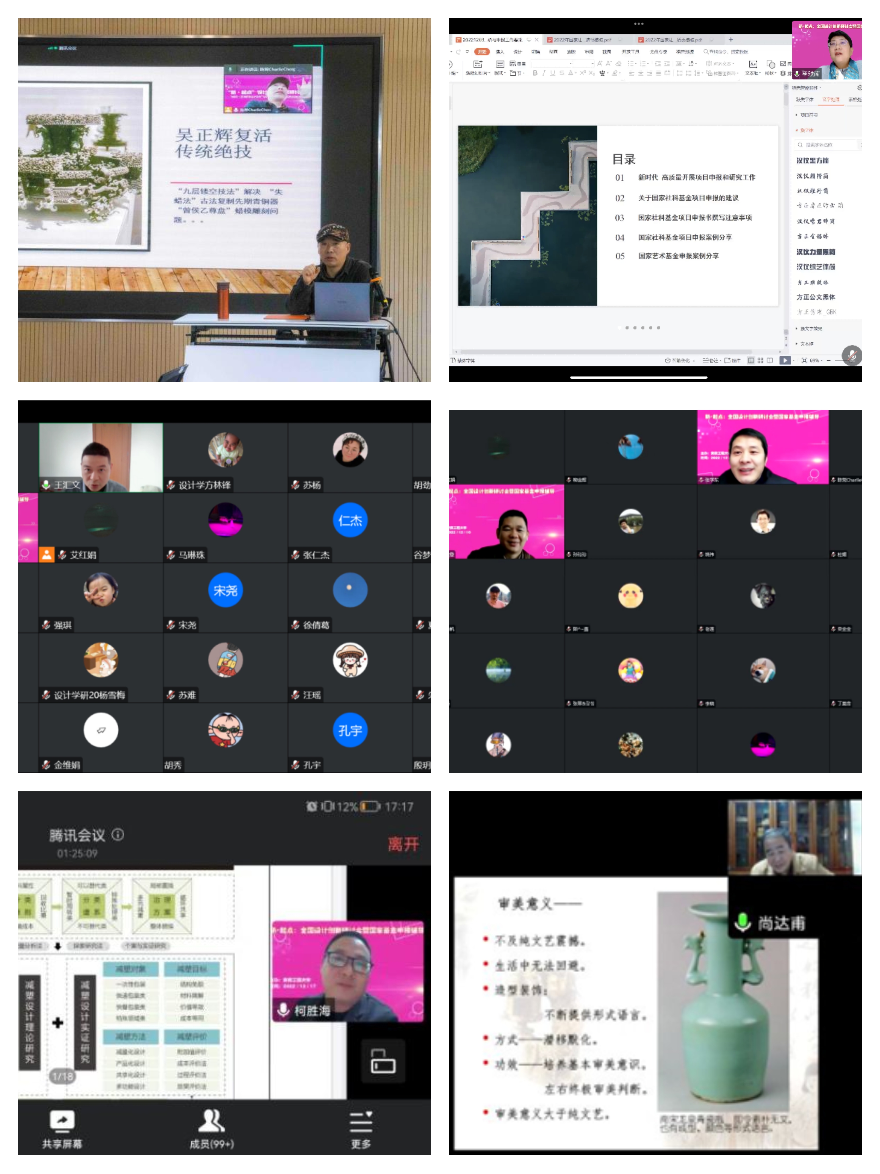 为促进设计学学科发展和国家基金项目申报,艺术学院克服疫情影响,通过线上举办了新•起点”全国设计创新研讨会暨国家基金申报系列讲座,6位设计学领域专家受邀分四场作学术报告。艺术学院全体教师和部分研究生参加了学术报告会。