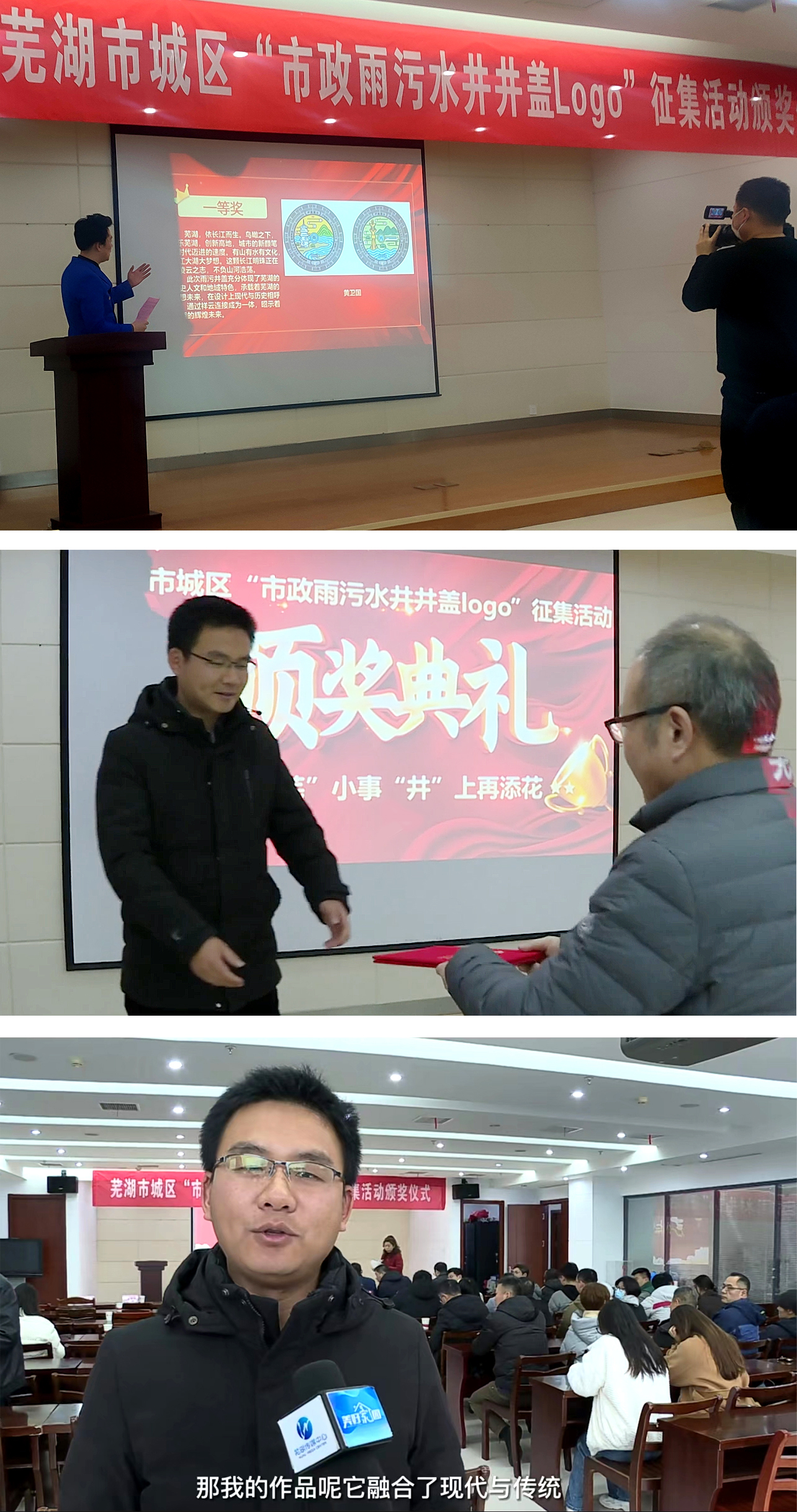 近日,芜湖市排水处会同芜湖传媒中心组织召开了芜湖市城区市政雨污水井井盖Logo征集活动颁奖仪式。设计学院动画专业黄卫国老师的设计作品获一等奖(采用奖),该作品将被批量生产在全市范围内投入使用。