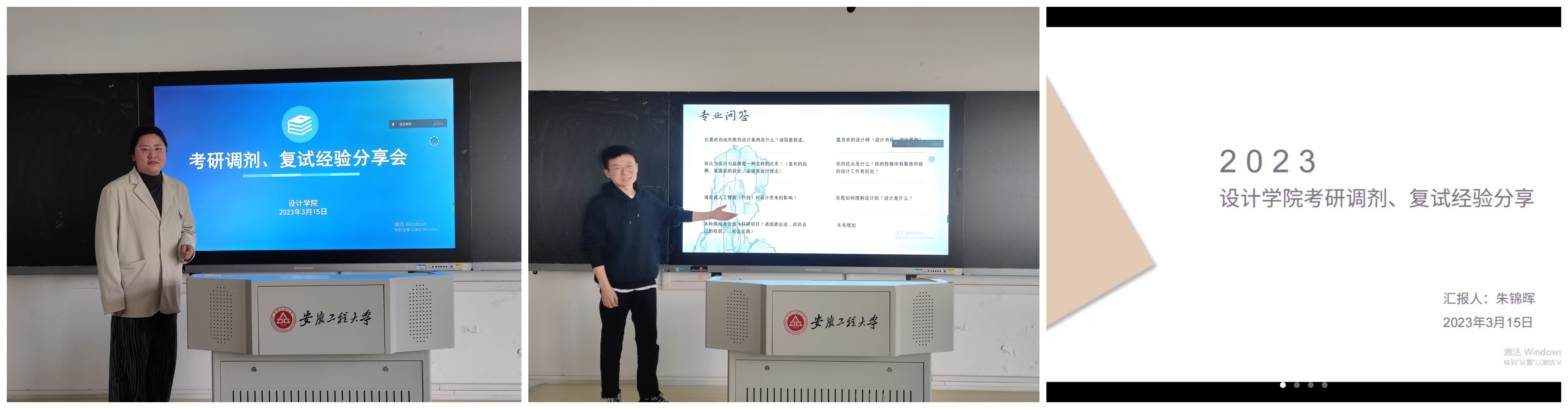 近日,设计学院在8教310教室举行考研复试、调剂经验分享会,本次分享会采取线上线下相结合的方式,邀请我院研究生辅导员黄淑怡、2018级考研成功的张翔、朱锦辉两位同学进行考研复试、调剂经验交流分享。会议由2019级辅导员顾安骏主持,2019级辅导员田潇濛和考研同学参加。