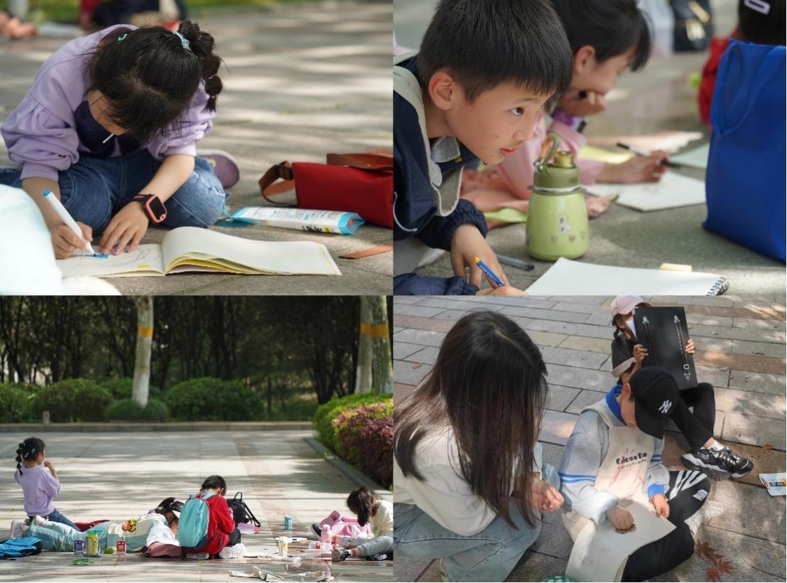 4月16日下午,小组成员开展了观影、手绘明信片、寄语成长、趣味写生等活动,引领学生在健康向上的审美实践中感知艺术、体验艺术,逐步提高感受美、欣赏美、创造美的能力,从而产生内驱力,提升美育素养。在趣味写生活动中,小朋友们拿着画笔在设计学院楼前挥洒春日美景,记录绣球花的迎风舞动,渲染湖水的片片涟漪,亦或是在师生活动中心旁描摹雕塑,听志愿者讲述作品《收获》的故事。