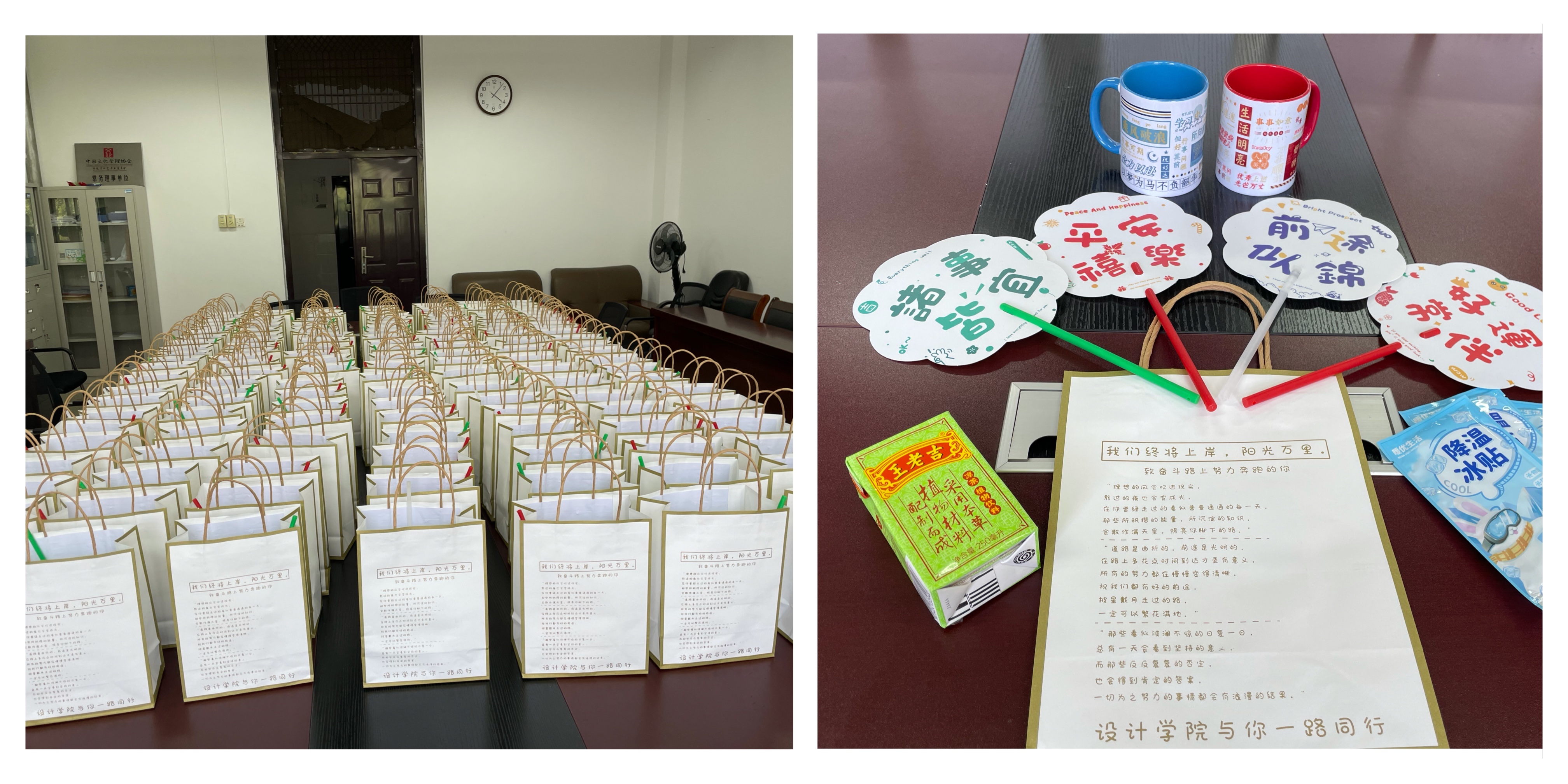 座谈会后,学院领导和老师为留校的每一位同学送上“励志牌”清凉慰问礼包,刻有励志文案的杯子和扇子为奋斗的同学们带来不断前进的力量,降温贴和凉茶为酷暑中坚持学习、实践的同学们带来一丝清凉。一份份清凉慰问礼包饱含了学院对留校学子们满满的爱护与关怀,把清凉送到学生手上、把关爱送到学生心上,希望他们能够乘风破浪,绽放光芒。