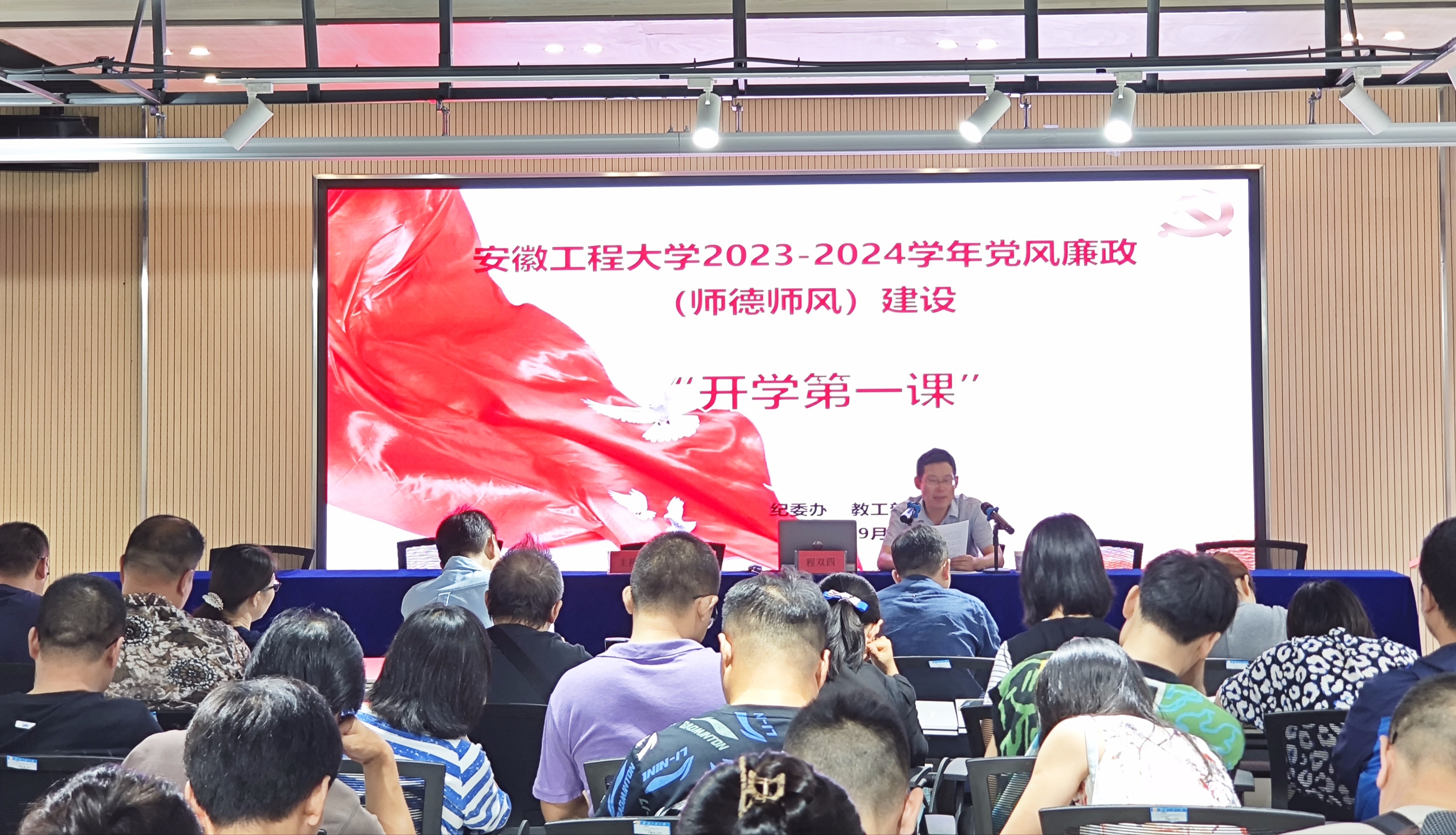 为深入学习贯彻习近平新时代中国特色社会主义思想和党的二十大精神,进一步巩固主题教育成果,引导广大党员干部、教职工树立廉洁自律意识,加强师德师风建设,9月20日下午,校党委常委、纪委书记、监察专员程双四为设计学院全体教职工作党风廉政(师德师风)建设“开学第一课”专题报告。学院党委书记胡家增主持报告会。学院党政领导班子、全体教职工参加报告会。
