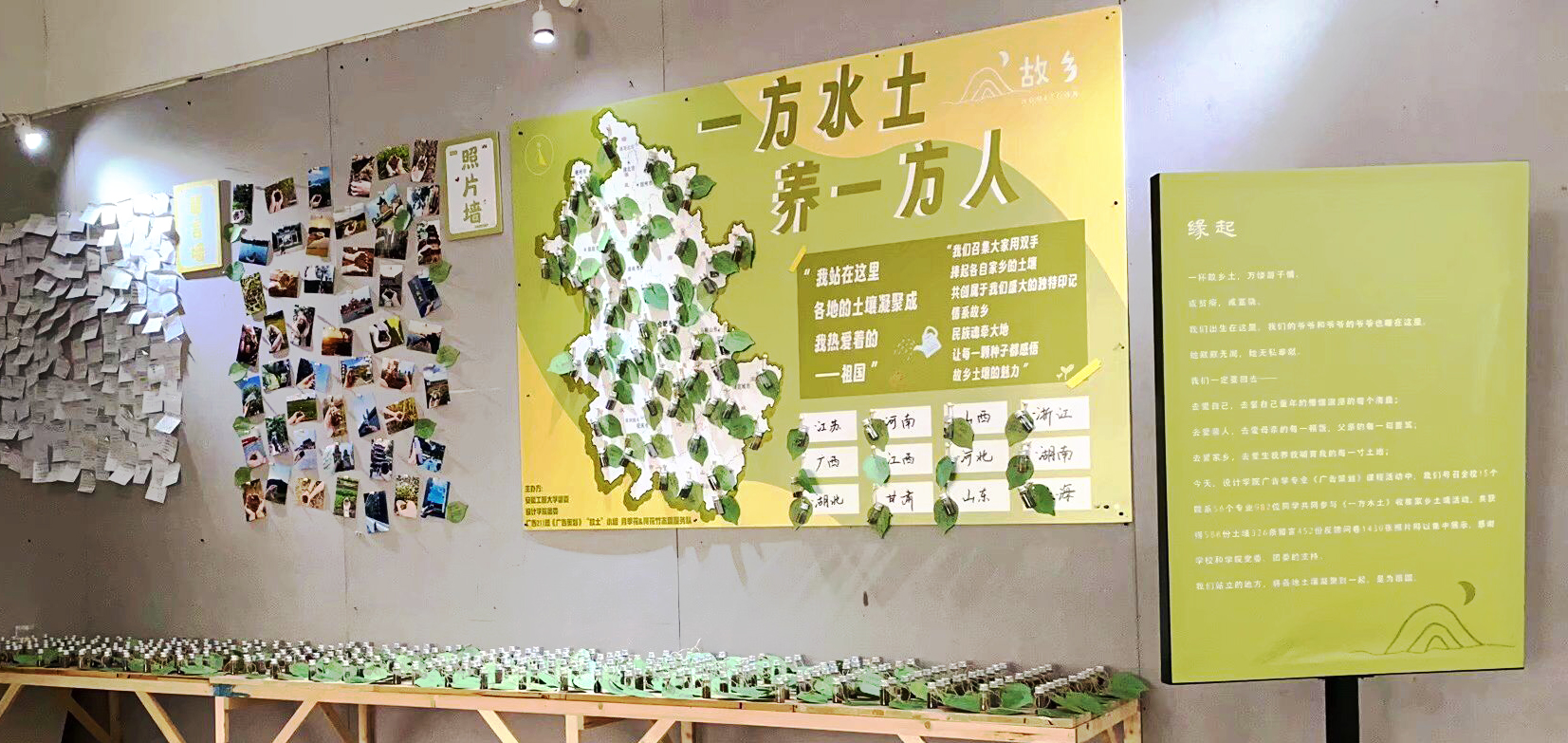 此次教学活动涉及面最广的“一方水土养一方人”项目,动员全校15个院系56个专业982位同学共同参与收集家乡土壤活动,经筛选获得有效样本588份土壤、326条留言、452份反馈问卷、1430张图片,在设计学院一楼展厅集中展示。传播范围最远的“月亮的心愿”项目,开展“边远地区困境儿童爱心助学一元捐公益活动”,对接我国最北端的漠河市西林吉镇社区,满足了16个困境儿童的微心愿。最具互动的“留下!好人好事”项目,采用了请同学们拆盲盒后填写和绘制好人头像的趣味形式宣传好人事迹和精神,让参与的同学用自发行为营造崇德向善、见贤思齐的校园氛围,塑造学生文明、健康、积极向上的精神面貌。