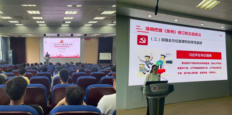 常务副院长张学东主持教师党员和非毕业班学生党员读书班专题教育,并领学《中国共产党纪律处分条例》总则部分内容。学院党委副书记彭海燕做“《中国共产党纪律处分条例》辅导报告”,从深刻认识修订《条例》的重要意义、准确把握《条例》修订的主旨意义、抓好《条例》的贯彻执行,以严明的纪律推进党的自我革命三个方面进行深入解读,让党员对党的纪律要求有了更加清晰、更加深刻的认识。她强调要把学习贯彻《条例》作为重要政治任务,以严明的纪律推进党的自我革命,不断提升党员干部的政治素养和拒腐防变能力,使廉洁自律规范内化于心、外化于行,守住纪律“底线”、不越法律“红线”,切实以学纪、知纪、明纪、守纪的优良纪律作风保障学院事业高质量发展。 全体党员集中观看了反腐倡廉警示教育片《永远吹冲锋号》第四集《永远在路上》。