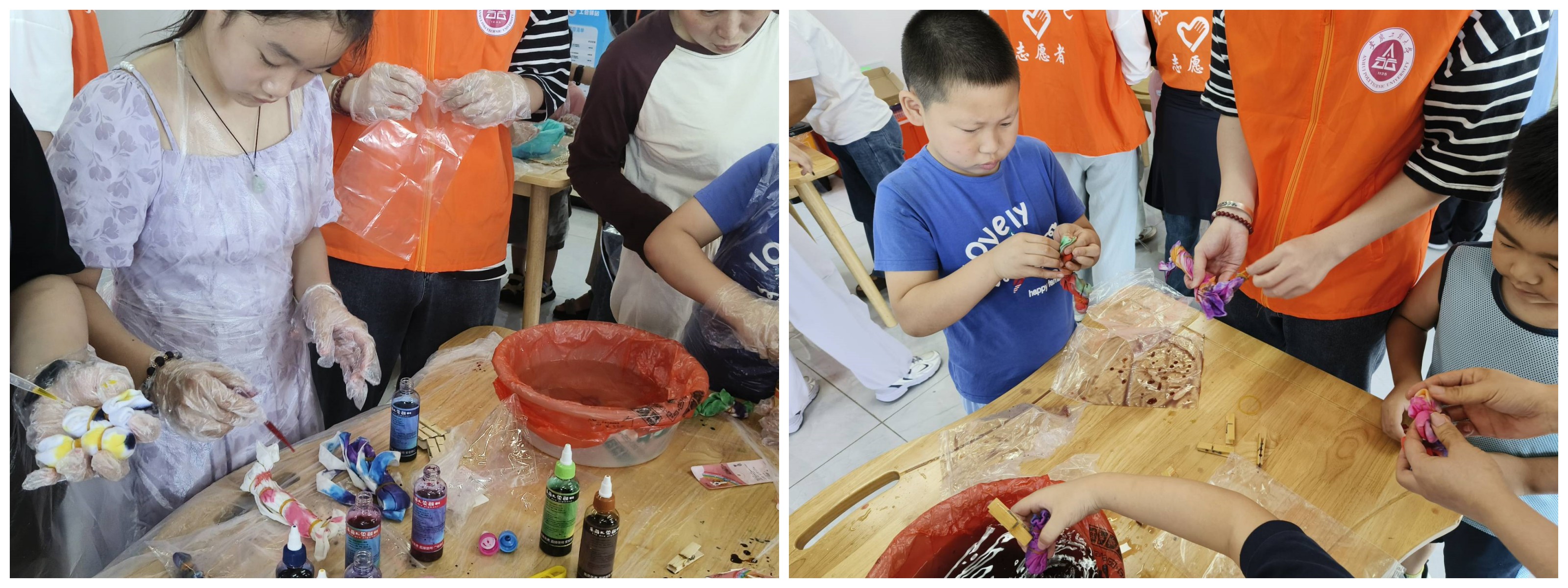 活动当天,设计学院的师生志愿者们早早地来到了活动现场,布置好了扎染工作坊,并准备了丰富的扎染材料和工具。随着参与活动的亲子家庭陆续到来,现场气氛逐渐升温,充满了欢声笑语。活动伊始,志愿者们向家长们和孩子们详细介绍了扎染的历史渊源、艺术特色以及制作流程。通过生动的讲解和演示,大家对扎染这一传统手工艺产生了浓厚的兴趣。