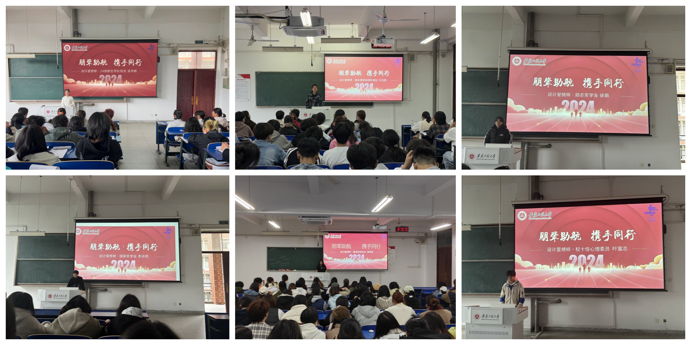 在随后的宣讲中,“设计星榜样”团队走进主题班会,深入学生,向同学们分享他们的学习经验、工作经历以及取得阶段性成果的方法。他们以自身的成长故事,分享成长感悟,激励同学们在面对学术压力、生活挑战时,保持积极向上的态度。国家奖学金获得者李诗琪在宣讲中,向学生传递了一个理念:一定要给自己树立一个目标,并为之努力奋斗。优秀学生干部、校特等奖学金获得者秦方蕊建议新生们,利用好课余时间拓展和提升个人能力与素质。“十佳心理委员”叶宣志讲述自己担任班级心理委员的心得体会,号召同学们用奋斗扬起逐梦风帆,在新时代新征程上接续奋斗。