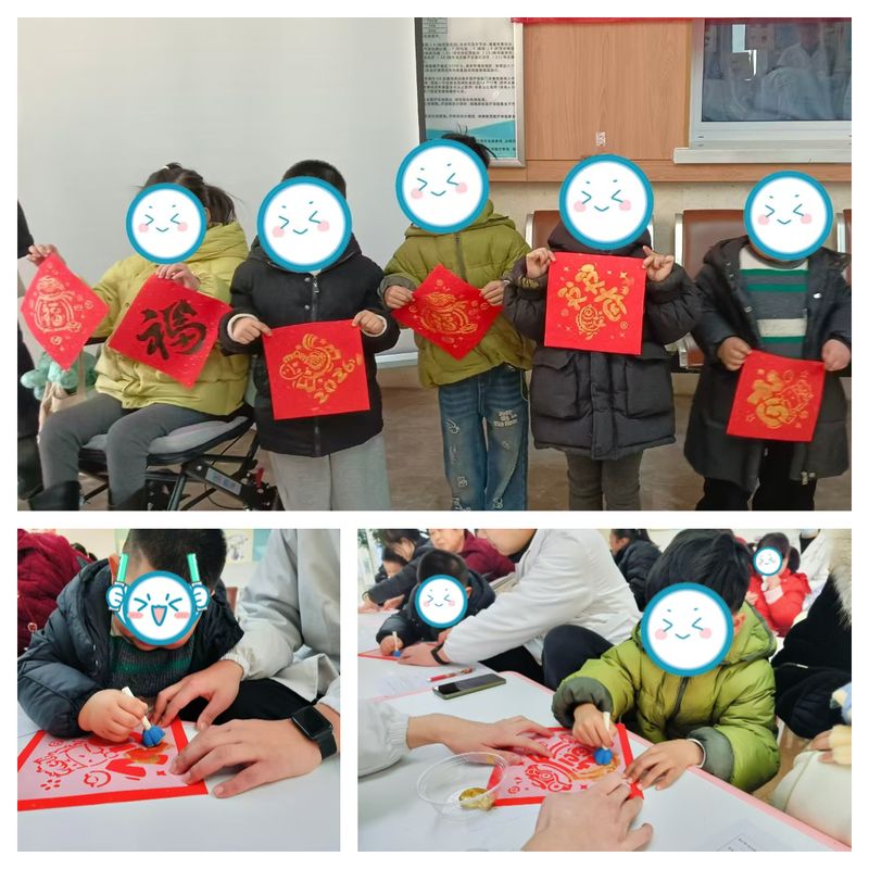 “小手按下去,福气升起来!”在党员教师的轻声引导下,孩子们触摸宣纸纹理、感受印墨晕染,当一枚枚饱满的“福”字跃然纸上,现场响起此起彼伏的惊叹与欢笑。亲子共同用金粉点亮“倒福”,把作品装进特制的“福气袋”带回家,实现“疗愈—创作—陪伴”的闭环。所有作品经高清扫描后,将由艺术疗愈团队统一建档,成为孩子们康复档案里的“成长年轮”。