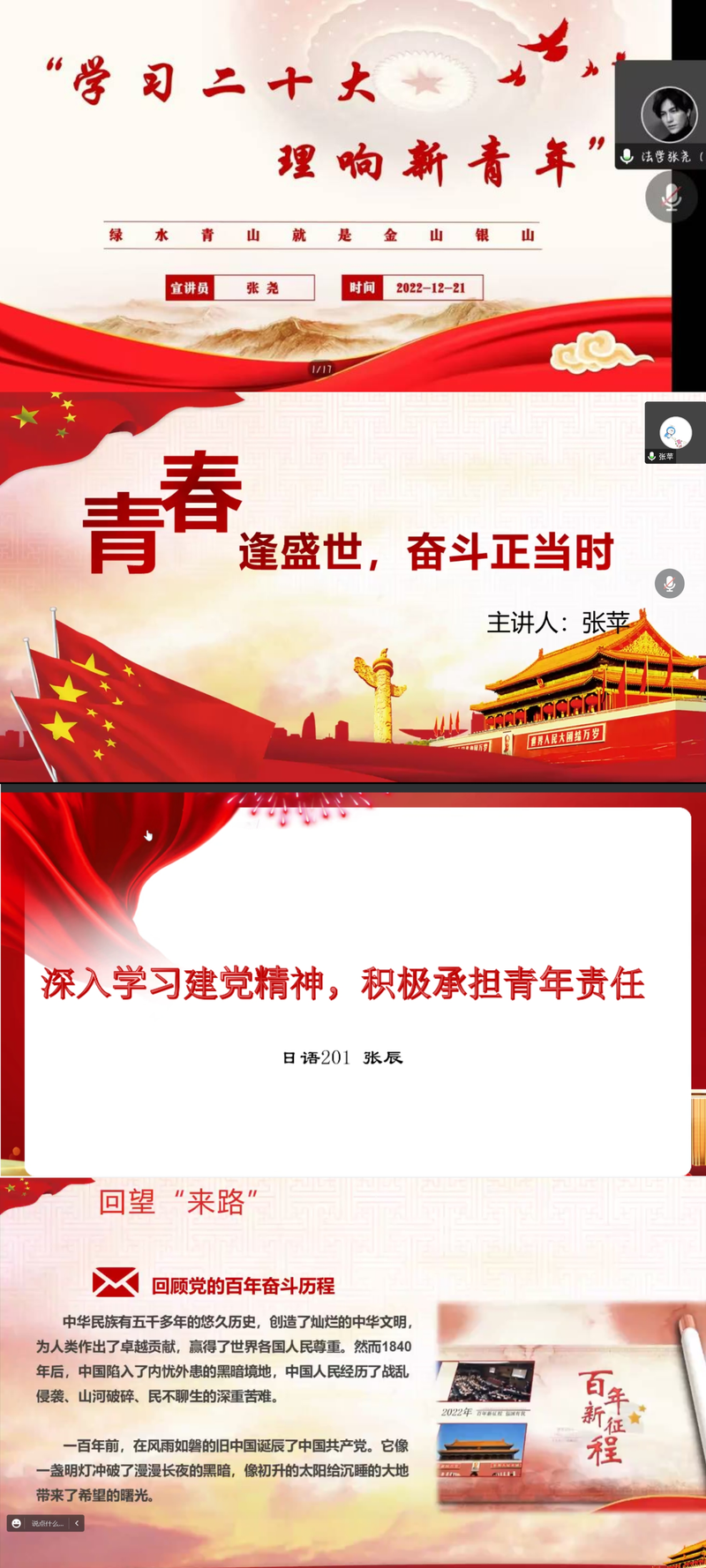 坚持线上领读与线上宣讲相结合,多举措提升学习效率。通过校团委微信公众号推送校领导、职能部门负责人、团组织书记、师生代表领读党的二十大报告音频2期;组织参加“学习党的二十大、领学新思想”大学生线上学习活动,1个领读视频在“安徽学联”视频号展播。举办“学习党的二十大 理响新青年”大学生理论宣讲大赛,鼓励学生采用线上线下多种方式宣讲党的二十大精神,截至目前已开展线上宣讲10余场。