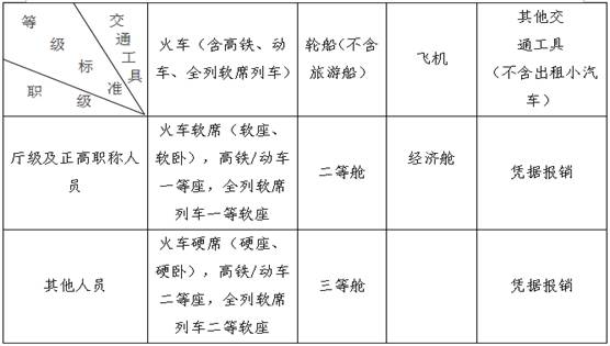第一章 总 则 第一条 为加强和规范差旅费管理,保证学校各项工作的顺利开展,本着勤俭节约、保证必需、便于操作的原则,参照省财政厅《安徽省省直机关差旅费管理办法》(财行〔2014〕97号)和省教育厅《安徽省教育厅转发安徽省省直机关差旅费管理办法的通知》(皖教秘财〔2014〕31号)以及省财政厅《安徽省财政厅关于调整安徽省省直机关差旅住宿费标准等有关问题的通知》(财行〔2015〕2034号)、《中共安徽省委办公厅 安徽省人民政府办公厅印发〈关于改革完善省级财政科研项目资金管理等政策的实施意见〉的通知》(皖办发〔2016〕73号)的规定,结合学校实际情况,制定本办法。 第二条 本办法适用于纳入学校统一核算的各学院、各部门(以下简称部门)。二级核算单位可参照执行。 第三条 本办法所指差旅费是指学校师生员工离开芜湖城区(不含出国(境))开展公务活动所发生的城市间交通费、住宿费、伙食补助费和市内交通费。 第四条 本办法不包括探亲、调动、挂职锻炼、到基层单位实习(见习),支援工作(扶贫、支教)、进修学习等发生的差旅费。 第五条 严格差旅费预算管理,超预算一律不得报销。各学院、各部门要严格履行出差审批手续,严格控制出差人数和天数。严禁无实质内容、无明确公务目的的差旅活动,严禁以任何名义和方式变相旅游,严禁异地部门间无实质内容的学习交流和考察调研。 第二章 城市间交通费 第六条 城市间交通费是指出差人员因公临时到芜湖城区以外地区出差乘坐火车、轮船、飞机等交通工具所发生的费用。 第七条 出差人员应当按规定等级乘坐交通工具。未按规定等级乘坐交通工具的,超支部分自理。出差人员乘坐交通工具等级见下表: